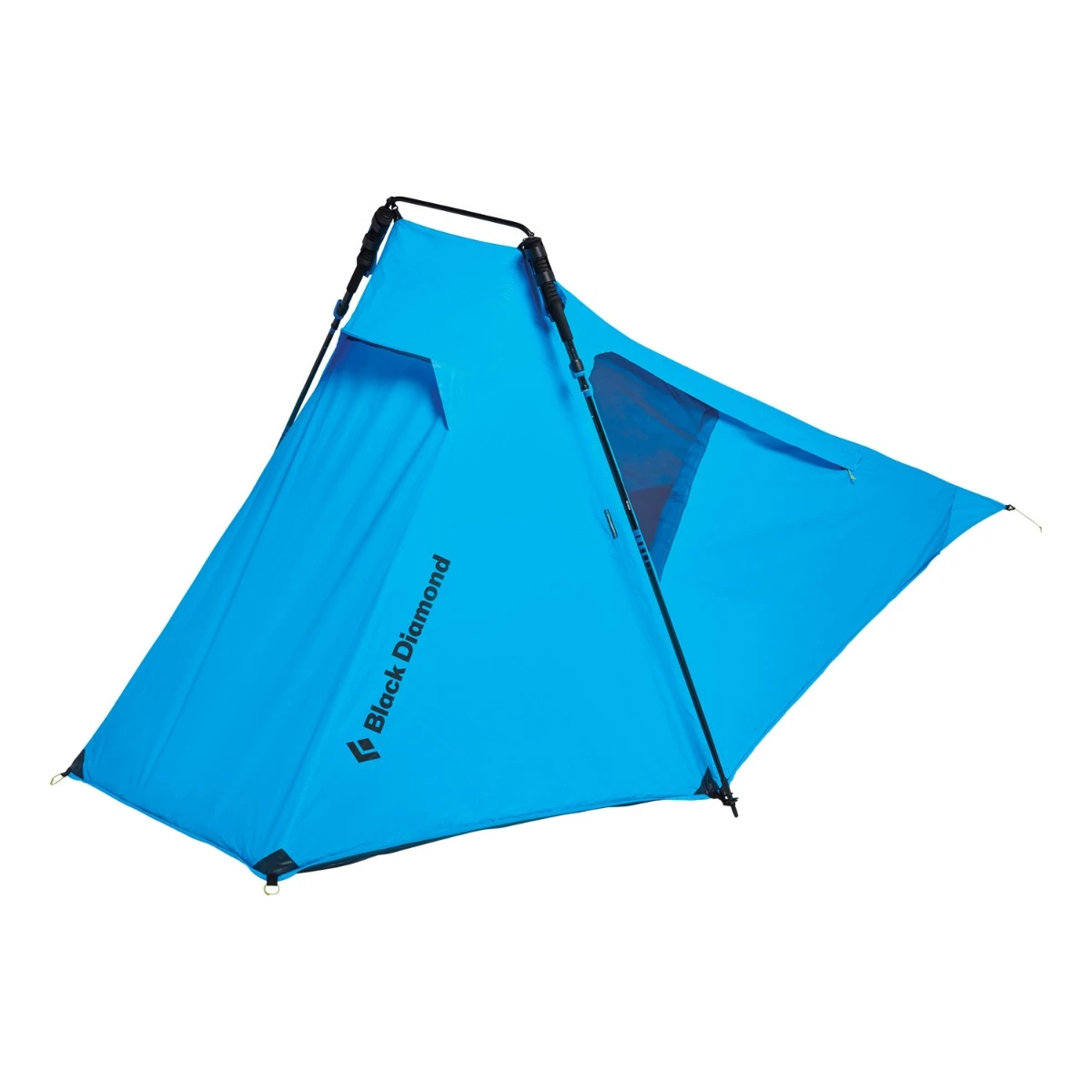 A compact, ultralight two person, three-season shelter, the Black Diamond Distance is a single-wall tent built for weight-conscious backpackers, thru-hikers, and mountain adventurers. The structure is created using any two trekking poles (sold separately), with a small DAC cross pole that connects the two trekking poles. Four stake-out points anchor the tent to create the ultimate fast-pitch shelter that’s simple and stands up to windy conditions. Lightweight fabric allows the Distance to pack down to the size of a Nalgene bottle.