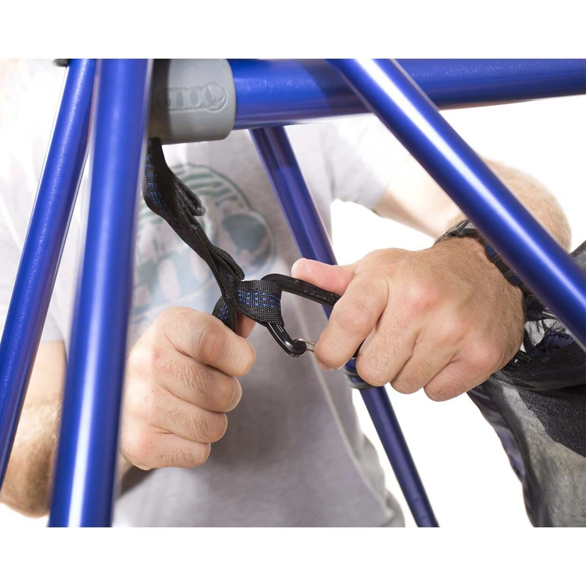 The revolutionary, free-standing Nomad Shelter System provides the perfect base camp for suspended camping. The well-ventilated bug net easily fits over the Nomad Stand to stop bugs in their tracks, while the fly, with two vestibule entry points and secure seams, keeps you and your gear dry through even the most intense storm.