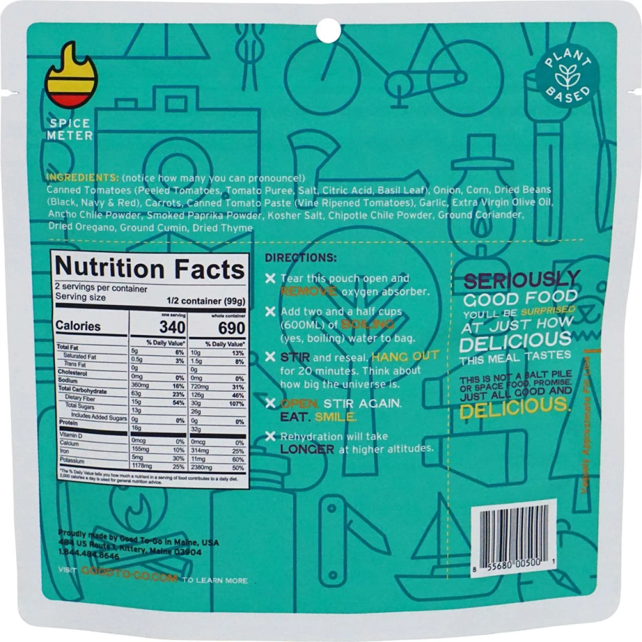 The Smoked Three Bean Chili from Good To-Go features the flavors of sweet tomatoes, nutty beans and gentle smokiness. The chili is slow cooked with fresh carrots, onions, garlic and corn. The melding of the spices and vegetables over time is what creates its complex flavors.
