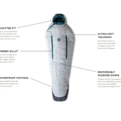Updated for 2021, Kayu™ men’s and women’s ultralight down mummy bags are pinnacle equipment for ultralight adventures. Careful tailoring of the hood, footbox, and body-mapped core creates an optimal fit with no excess weight or wasted space. Premium 800FP down and aggressive, thermally efficient patterning, make for a trusted companion on longer journeys where every ounce matters. NEMO’s flagship Thermo Gills™ allow you to regulate temperature without letting in drafts, deeply extending the useable temperature range. The waterproof/breathable footbox and hood protect from tent wall condensation. The exceptionally packable 800 FP down is hydrophobic, PFC-free, and 100% Responsible Down Standard (RDS) certified. Top shelf fabrics include a 20D nylon ripstop with DWR on the shell, an ultra-smooth 30D nylon taffeta lining, and a 40D nylon ripstop OSMO™ waterproof/breathable footbox.