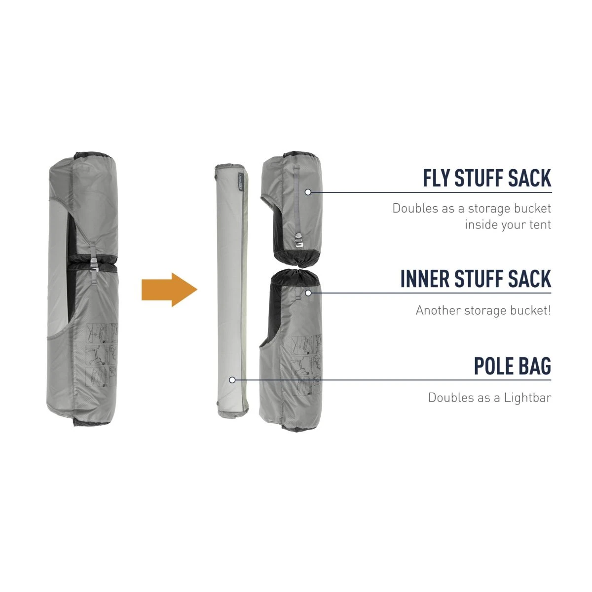 • FairShare™ storage system: tent packs into 3 stuff sacks to split the load. After set-up, stuff sacks transform into gear storage pockets.