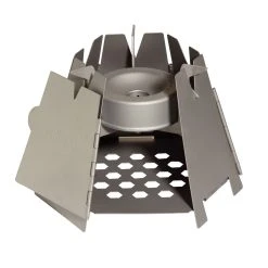 Convert the Vargo Outdoors stainless or titanium Hexagon Wood Stove* into a complete multi-fuel stove with the titanium Converter Stove. Its easy “drop-in” design turns the Hexagon into an effective windscreen while providing the ideal distance between stove and cookware for optimal cooking efficiency. Unlike other stoves, the Converter Stove will cook faster and won’t leave soot on the bottom of your pots. Burns alcohol, fuel tabs, fuel gels. Simply flip the stove over to switch between alcohol and fuel tab/gel burning modes. The folding stand allows for compact packing and use as a standalone stove.